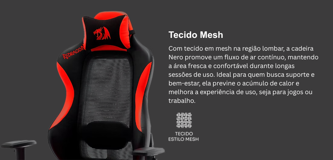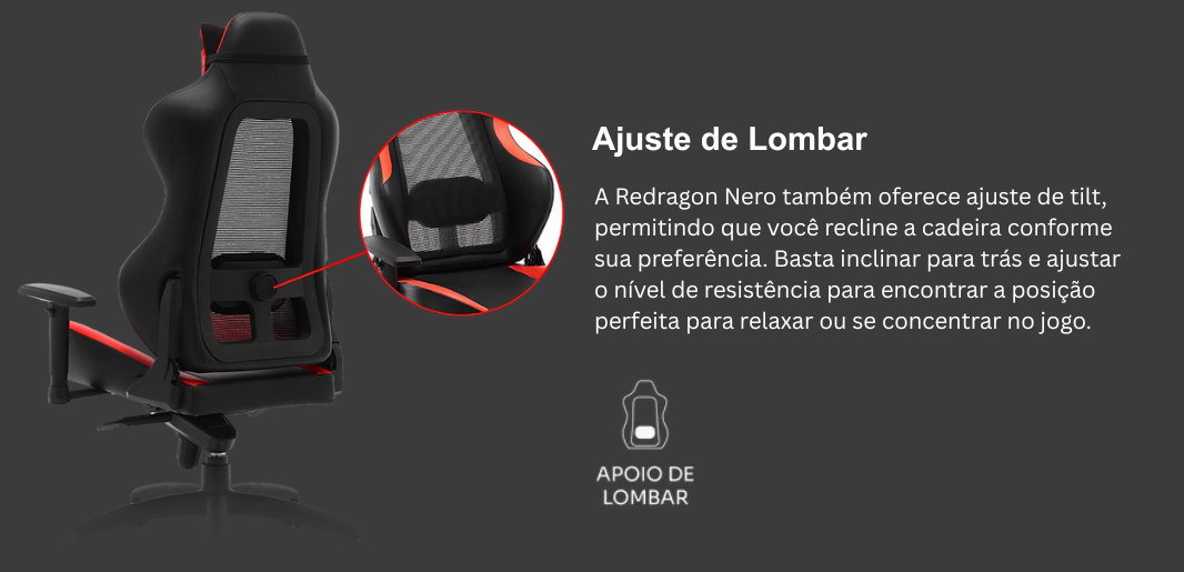 - Apoio da lombar com ajuste e em tecido estilo mesh para maior “respiração” na área